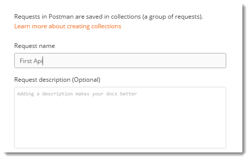 3. 사용중인 First Api 와 같이 의미있는 Request Name(요청 이름)을 입력합니다 . API에 대한 설명을 사용하여 나중에 다른 팀 동료와 자신을 위해 API가 수행 한 작업에 대해 기억할 수도 있지만 선택 사항입니다.