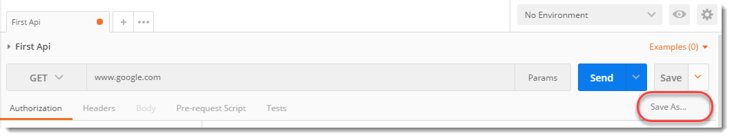7. "First Api"를 덮어 쓰려면 Save(저장)을 누르 거나 표시된대로 드롭 다운을 누르고 Save as(다른이름으로 저장)을 누릅니다.