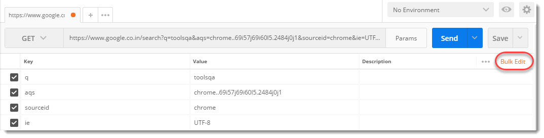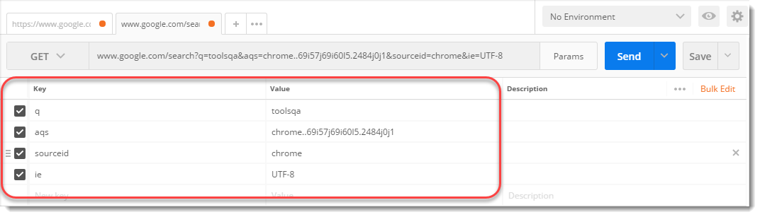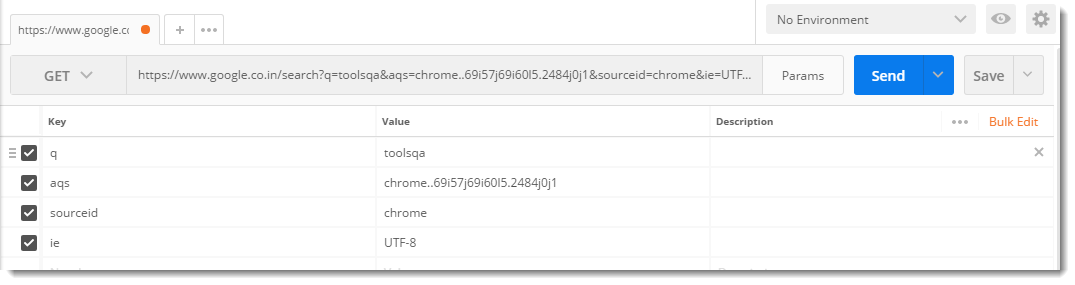 예를 들어 다음과 같이 포스트맨 내부에 이 URL을 복사하여 붙여 넣습니다. https://www.google.co.in/search?q=toolsqa&oq=toolsqa&aqs=chrome..69i57j69i60l5.2885j0j4&sourceid=chrome&ie=UTF-8