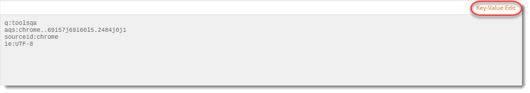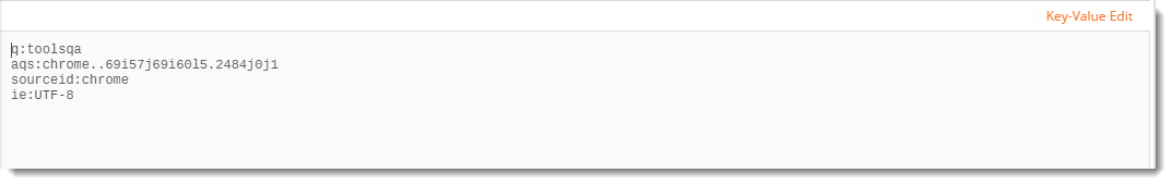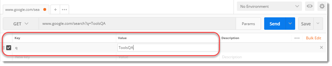 2. 그림과 같이 키-값 쌍 아래에 다음 내용을 작성 합니다. 여기서도 q 는 쿼리 를 나타내고 ToolsQA는 검색 용어입니다. 이제 보내기를 누릅니다 .