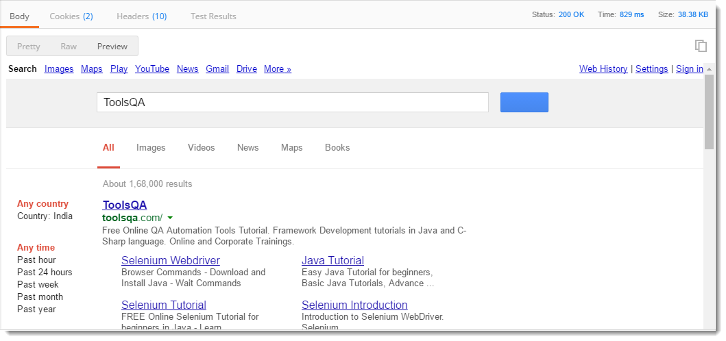 3. 미리보기를 보면 Google 홈페이지 대신 ToolsQA 라는 특정 검색어에 대한 응답을 받았음을 알 수 있습니다. ToolsQA 대신 무엇이든 작성하고 응답을받을 수 있습니다. 이것은 우리가 보고자하는 결과에 대한 정보 ( Parameters )를 전달했음을 나타냅니다 .