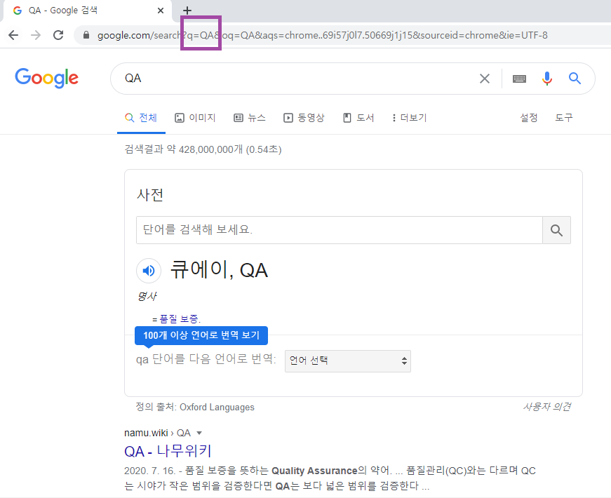 2. Google의 응답 페이지가 표시됩니다. 검색 창에 QA 를 입력 하고 Google 검색을 누릅니다 .