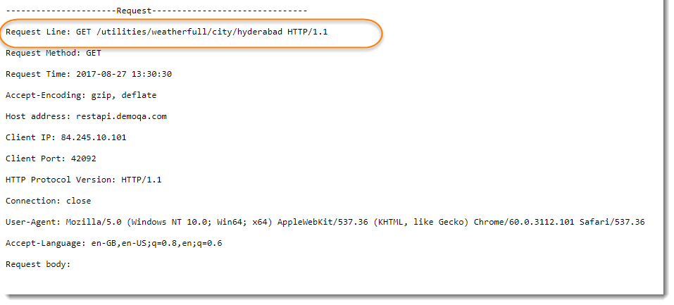 도시 이름은 URL 끝에 있는 매개 변수 쿼리를 통해 URL에 제공됩니다. 하이데라바드의 날씨 정보를보고 싶다고 가정해 보겠습니다. 이 경우 URL은 http://restapi.demoqa.com/utilities/weatherfull/city/hyderabad 가됩니다.