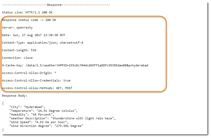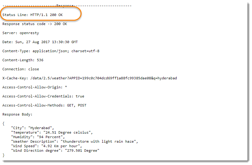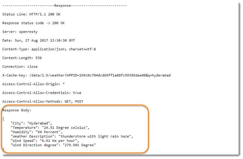 응답 본문 에는 클라이언트가 요청한 리소스 데이터가 포함됩니다. 이 예에서는 날씨 데이터에 대해 City Hyderabad 가 요청되었습니다. Response Body를 보세요.여기에는 도시의 날씨 정보가 포함되어 있습니다. 또한 온도, 습도, 날씨 설명 및 도시의 추가 날씨 속성에 대한 정보가 있습니다.