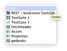 스냅 샷에서 Globals, Project, Test Suite1 등 을 볼 수 있습니다. Global 을 선택하면 우리가 정의한 전역 속성을 선택할 수 있습니다. 아래 스냅 샷에서 우리는 글로벌을 소스로 선택했습니다 .
