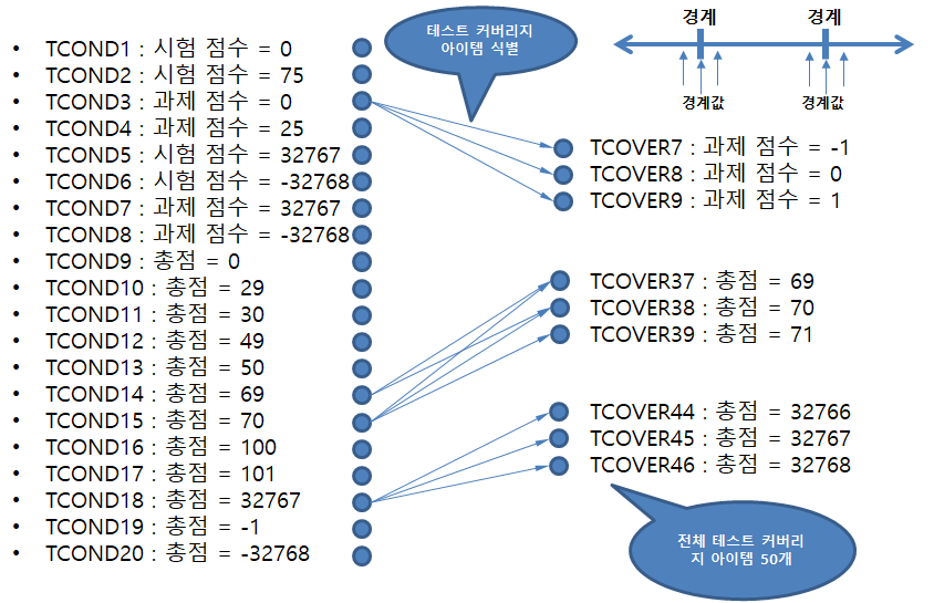 입력 | 총 점 | 테스트 커버리지 아이템 | 기대 결과 | 테스트 된 경계 값 | |