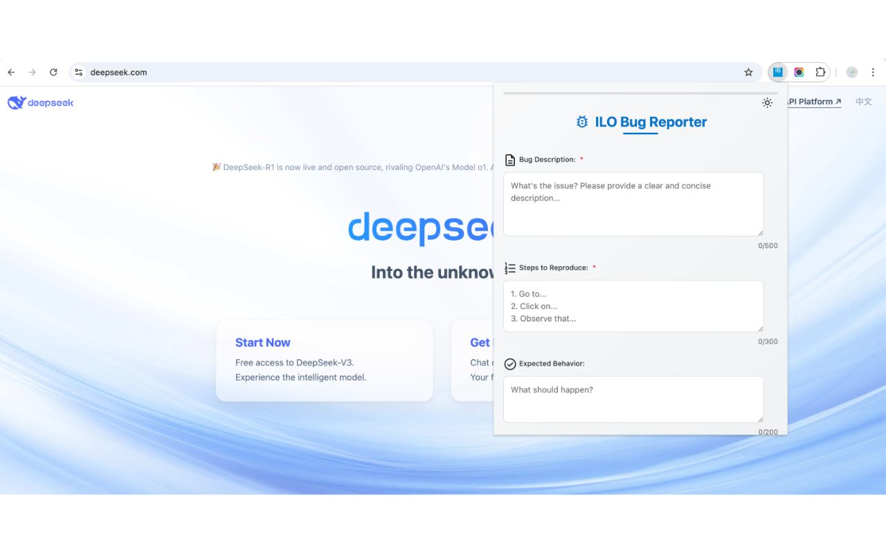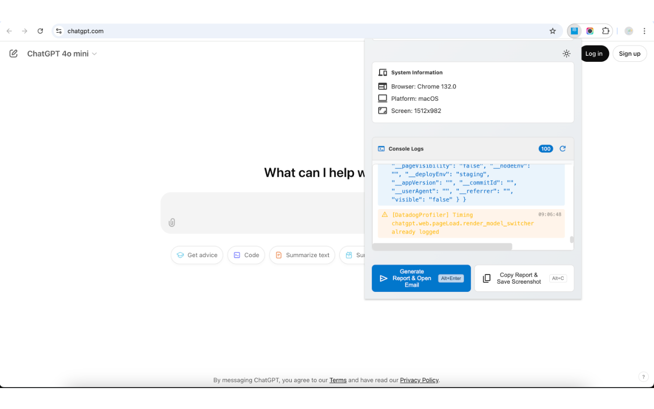 - 강력한 기술 로그: 클릭 한 번으로 콘솔 로그와 네트워크 요청 내역을 요약해서 첨부합니다.
