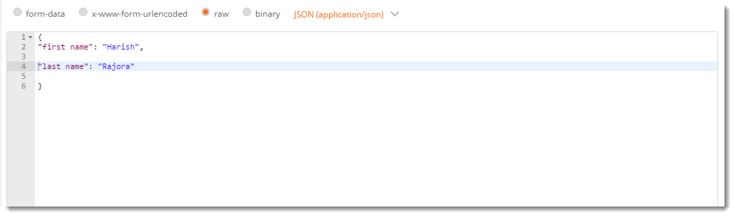 Raw는 POST 메서드에서 본문을 보내는 동안 가장 많이 사용되는 부분 또는 옵션입니다. Postman의 관점에서 중요합니다. 원시는 본문 메시지가 요청 본문을 나타내는 비트 스트림으로 표시됨을 의미합니다. 이러한 비트는 문자열 서버로 해석됩니다.