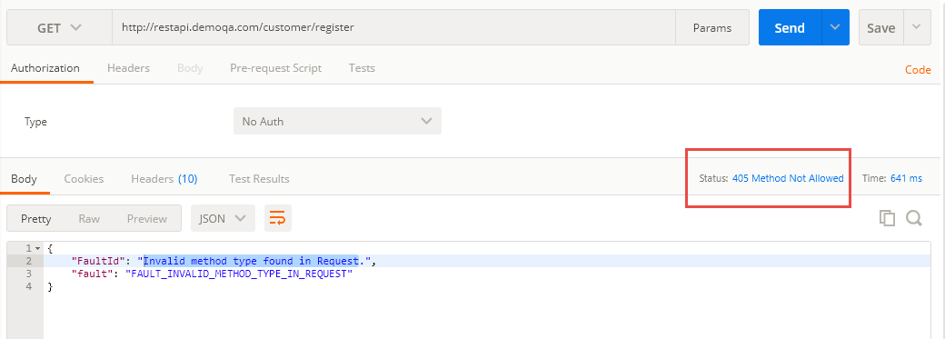 1. Postman 엔드 포인트 표시 줄에서 API http://restapi.demoqa.com/customer/register ( 이 API는 새 고객을 등록하는 데 사용됨)를 사용 하고 [Send]보내기를 누릅니다 . 메서드 유형 드롭 다운에서 GET 이 선택되어 있는지 확인합니다 .