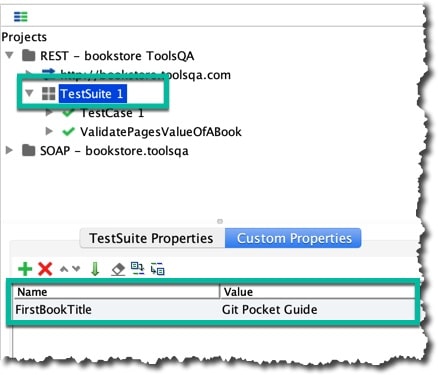 위의 스크린 숏에서 이름이 " FirstBookTitle "이고 값이 " Git Pocket Guide "인 속성을 테스트 스위트 " TestSuite1 " 아래에 추가했습니다.