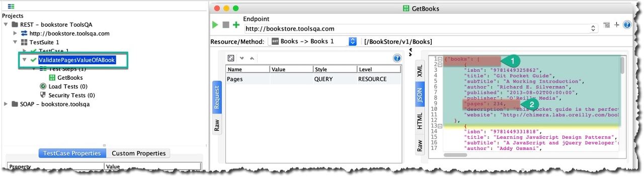 위의 샷에는 여기에" ValidatePagesOfABook"이라는 이름으로 책의 페이지 ( 왼쪽에 강조 표시된 부분 참조)를 확인하는 테스트가 추가되었으며 스크린 숏 오른쪽에는 다음과 같이 강조 표시되어 있습니다.